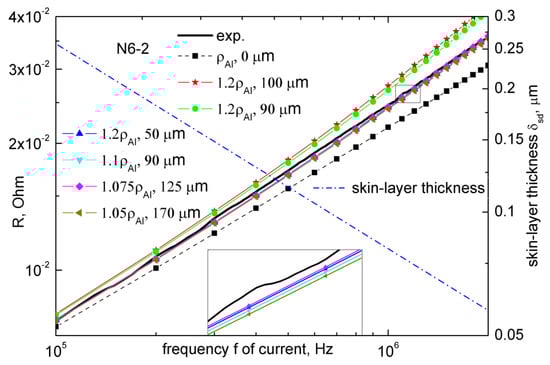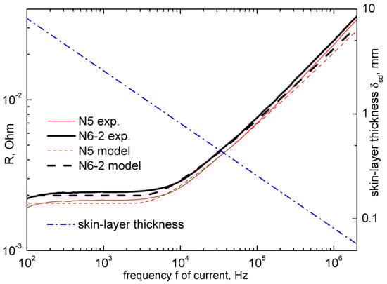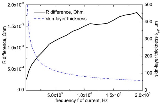 For a cylindrical wire with a length l much larger than its radius r, the dependence of the resistance R on the frequency f is generally described as follows []: