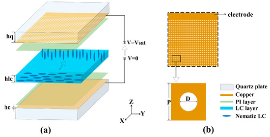 Figure 1a shows the overall structure of the proposed device. The top surface of the bottom quartz substrate is printed with a complete copper surface, which can be used as a ground plane, and the bottom surface of the top quartz substrate is printed with a copper layer with a circular hole pattern. The upper and lower quartz thicknesses, dielectric constant, and loss tangent are 480 µm, ε = 3.78, and tanδ = 0.002, respectively. As shown in Figure 1b, the thicknesses of the LC layer and copper layer are hlc = 45 µm and hc = 0.5 µm, respectively, where hlc is controlled by microspheres and the copper is deposited by thermal evaporation. The diameter of the hollow circle is 800 µm and the period of the unit-cell is 1600 µm. Table 1 lists the geometric parameters of the unit-cell structure.