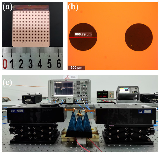 A standard photolithography process produced the FSS structure shown in Figure 2a. On the lower surface of the top quartz, a layer of periodic metal metamaterial unit cells was formed by means of exposure, developing, and etching. Figure 2b shows the image of the unit cells of the periodic pattern under a metallographic microscope. Figure 2c shows the apparatus used for sample testing. The spectral response of the sample was tested by a vector network analyzer (Agilent N5224A), which was accompanied by two horn antennas (with a frequency range of 90-140 GHz, a gain of 21 dB and a 3 dB bandwidth of 12 degrees) and an F-band module extender (N5262AW08). The S21 parameter of the vector network analyzer represents the electromagnetic wave reflected from the sample. During the experiments, the samples were placed in a hole dug in the absorbing material, which can reduce reflections from the environment. The humidity and temperature of the room remained constant during laboratory testing (the air temperature was 23 degrees Celsius and the relative humidity was 45–55%). During the test, 1000 points were scanned in the vector network analyzer in the 90–140 GHz band, and the test error was not more than 0.05 GHz. Additionally, the numerical results for the resonant frequency points obtained from the FEM were fitted to the experimental measurement results by changing the dielectric constant of LC layer in the computational model. Thus, the equivalent dielectric constant of LC layer was obtained [26].