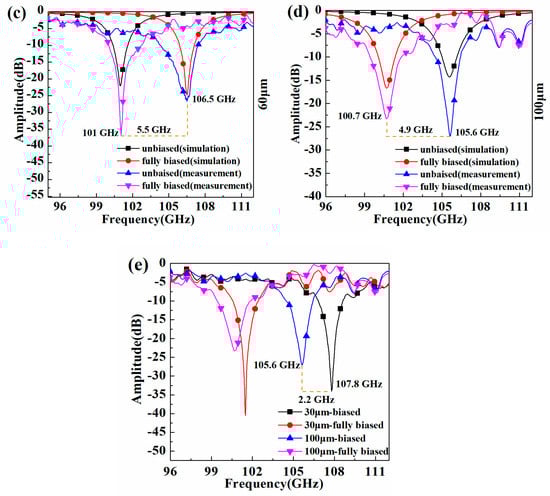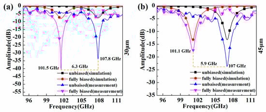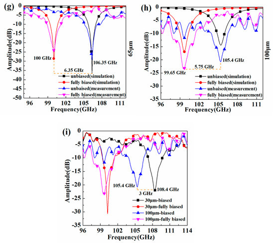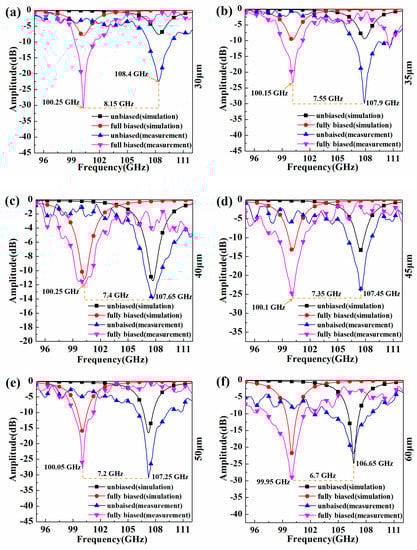Figure 3 shows the simulation and experimental results obtained for the S200 LC (Shijiazhuang Chengzhi Yong Hua Display Materials Co., Ltd.) with hlc = 30, 35, 40, 45, 50, 60, 65, and 100 µm. When the thickness of the LC layer is 30 µm, the maximum shift range of the resonant frequency is 8.15 GHz. The resonant frequency of the FSS shifts toward lower frequencies (from 108.4 to 105.4 GHz) as the thickness of the LC layer increases from 30 to 100 µm without any bias voltage. On the other hand, when the applied bias voltage reaches saturation, the resonant frequency remains almost constant at around 100 GHz. Since the LC molecules under the hollow circular region of the patterned copper layer cannot be completely reoriented, the maximum error at the resonant frequency point is about 0.91%, and the corresponding LC layer equivalent dielectric constants error is about 2% [29]. In addition, we also considered the influence of hollow circle radius errors caused by manufacturing. In this study, the hollow-circle radii measured by metallographic microscope were used for the fitting of the equivalent dielectric constants, so the errors due to the hole radius were very small. It can also be seen from the figures that each resonant frequency on the FSS features a one-to-one correspondence with the equivalent dielectric constant of the LC layer; this renders it possible to calculate the equivalent dielectric constant of the LC layer by fitting the frequency peaks on the FSS.