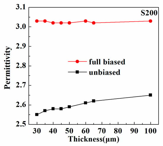 Permittivity as a function of the LC layer thickness for the LC S200 in the fully biased and unbiased states.