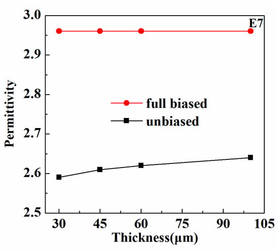 Permittivity as a function of the LC layer thickness for the LC E7 in the fully biased and unbiased states.
