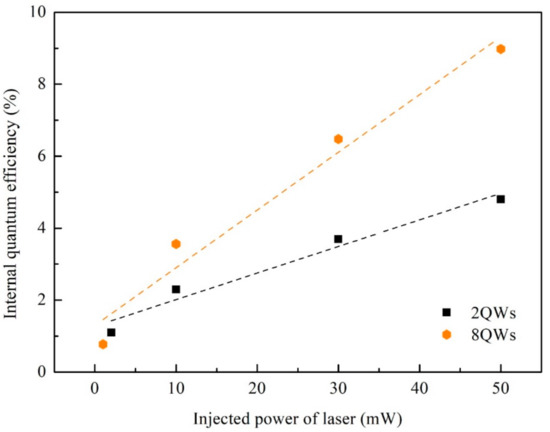 According to Equation (3), the IQE will increase with increasing carrier concentration n due to the enhanced radiative recombination, which is corresponded to the increase trend of IQE versus excitation power as shown in Figure 1. Meanwhile, Figure 1 shows the higher IQE for 8QW at higher excitation power. Two aspects may be related to the higher IQE of sample 8QW. On one hand, when the excitation power is the same, the carrier concentration in the quantum well is generally assumed to be the same due to the close light absorption coefficient in the same material. As a result, the IQE is mainly determined by the non-radiative recombination coefficient A, which corresponds to the non-radiative SRH recombination. Strong non-radiative SRH recombination is the main reason to the low IQE as reported in the literature [11,17].