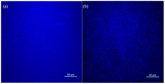To check that, Figure 2 presents the micro-PL comparison, in which the non-radiative recombination can be characterized by the non-luminescent area such as black spots. Unexpectedly, the non-radiative recombination got enhanced in sample 8QW as shown in Figure 2b, in which the black spots is so much that it presents an obvious labyrinth-like pattern comprised of bright and dark regions, while the black spots are less in Figure 2a for sample 2QW. The worse quality of sample 8QW may be caused by the longer high temperature growth process via MOCVD. The results indicates that the higher IQE in sample 8QW may be not related to weaken non-radiative SRH recombination. It is necessary to mention that the luminescence intensity of sample 8QW is stronger than that of sample 2QW due to the higher quantum well number. In order to observe the non-radiative area in micro-PL, the laser power and gain value is different for the measurement of the two samples. Therefore, the picture of Figure 2b is darker.