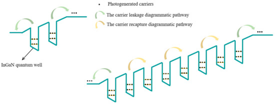 The schematic diagram of conduction band and carrier leakage pathway in sample 2QW and 8QW. Due to the larger number of well layers of sample 8QW, the carriers leaking out of quantum well are more likely to be recapture by another quantum well.