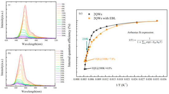 Figure 5a,b shows the TDPL spectra from 30 to 300 K for sample 2QW and 2QW-EBL, and Figure 5c presents IQE results derived from the TDPL spectra. The IQE at room temperature of sample with EBL is 7.8%, much higher than that of sample 2QW, which is 4.8%. The result consolidates the carrier leakage mechanism mentioned above. The results will be discussed in detail below.