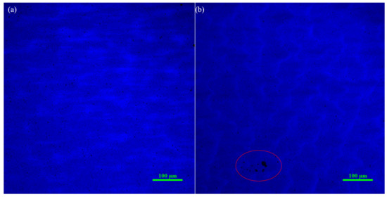 The micro-PL images of GaN-based MQW samples 2QW (a) and 2QW-EBL (b); the huge black spots shown in the red circle may correspond to the new kind of non-radiative recombination centers.
