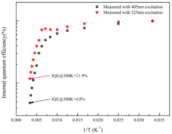 Another interesting result is that the IQE measured using 325 nm laser source is much higher than that using 405 nm laser source, as shown in Figure 7. The excitation power of 325 nm laser is 3 mW, which is much lower than that of 405 nm laser which is 50 mW. However, the IQE measured under 325 nm laser is 11.9%, while it is 4.8% when measured under 405 nm laser. As well known, the carriers in quantum barrier layers can be excited by 325 nm laser, which may be injected into quantum wells, thus, the carrier concentration increases significantly. As a result, the IQE when using 325 nm laser source is higher than that with 405 nm laser. The physical mechanism has been discussed in detail in our previous work [26]. Here, the injected carrier can also significantly enhance the IQE, which provide evidence to the huge effect of carrier leakage on the IQE from an opposite direction.
