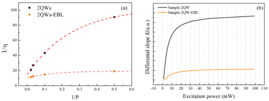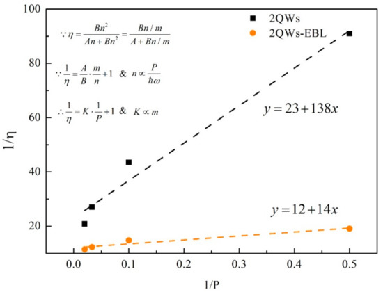Through Equation (7), the leakage factor can be analyzed qualitatively by the slope K. Figure 8 shows the data and linear fitting of reciprocal of IQE versus the reciprocal of excitation power for sample 2QW and 2QW-EBL. The slope K of sample 2QW-EBL is around one-tenth of sample 2QW. Assuming the similar ratio of non-radiative SRH recombination coefficient and radiative recombination coefficient A/B of MQW for the two samples, the degree of carrier leakage in sample 2QW-EBL is much lower than that of sample 2QW (considering the worse quality of MQW for sample 2QW-EBL, the carrier leakage in sample 2QW-EBL will be less.) However, the intercept is obviously higher than 1 and the linearity of the data is unsatisfactory. The slope K decreases with decreasing excitation power as pointed by the data shown in Figure 8. The results may indicate that the leakage factor m is dependent to the excitation power.