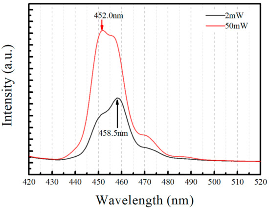 Figure 9a further presents the non-linear fitting results based on the least square method and the differential slope K is calculated and shown in Figure 9b, which obviously increases with increasing excitation power. The result indicates that the carriers leaked out of MQW may increase with increasing excitation power. Figure 10 shows the PL spectra of sample 2QW with 2 and 50 mW excitation laser power under 160 K. Significantly, the peak wavelength with 50 mW excitation laser power decrease from 458.5 nm to 452 nm, indicating a higher peak energy of PL spectra. When excitation power increases, electrons have a higher possibility to occupy localized states with higher energy [29], thus the recombination energy is higher with 50 mW excitation laser power. As a result, the quantum barrier height restricting carriers reduces and the electrons are easier to leak out of quantum wells. Meanwhile, we can find that differential slope K increases rapidly at low power stage, then slow down at higher power stage, suggesting that the carrier leakage is turn on at low excitation power and reach the saturation at higher excitation power. Such a turn-on excitation power is below 10 mW, indicating that the carriers leaked out of MQW is much easier than expectation in InGaN/GaN MQW under the optical excitation.