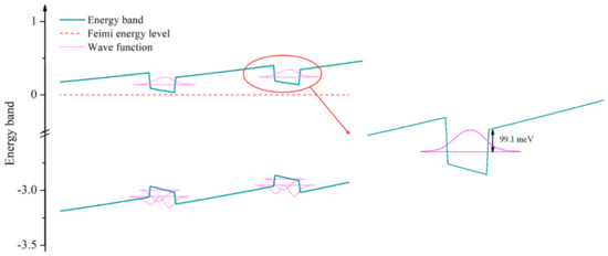 To understand why the carrier leakage happens easily in InGaN/GaN MQW, a simulation calculation of energy band structure of InGaN/GaN MQW are conducted by LASTIP program (Crosslight Software Inc., Burnaby, BC, Canada). The MQW parameters are corresponding to the HRXRD measurement results of sample 2QW (which has been listed above): the indium composition and thickness of well layers is determined to be 10.0% and 3 nm, while it is 2% and 11 nm in barrier layers, respectively. Figure 11 presents the calculated energy band structure, and we can find that only ground state energy level exists in In0.1Ga0.9N quantum well and the potential energy barrier hindering the carrier leakage is only 100 meV, which is in good agreement to the activation energy (91–102 meV) via Arrhenius fitting of temperature dependence of IQE. The higher energy gap between the ground state energy level and conduction band minimum is mainly caused by the small effective electron mass (m*) of InGaN and the narrow thickness of quantum well. According to the reports in the literature, the m* of GaN is 0.22 m0, while it is 0.11 m0 [30,31] (the m0 represents the free electronic mass) for the InN. Additionally, in this work, the quantum well thickness is as low as 3 nm. According to a simplified model of infinite deep square potential well, the discrete energy levels above the conduction band edge are in inverse proportion to the effective electron mass and square of quantum well thickness. The small effective electron mass of InGaN and the narrow thickness leads to a more prone carrier leakage mechanism in InGaN/GaN quantum well.