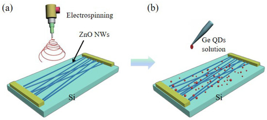 Schematic illustration of fabricating for Si/ZnO NWs/Ge QDs broadband PD. (a) A schematic view for electrospinning ZnO NWs. (b) A schematic spin-coating Ge QDs on ZnO NWs.