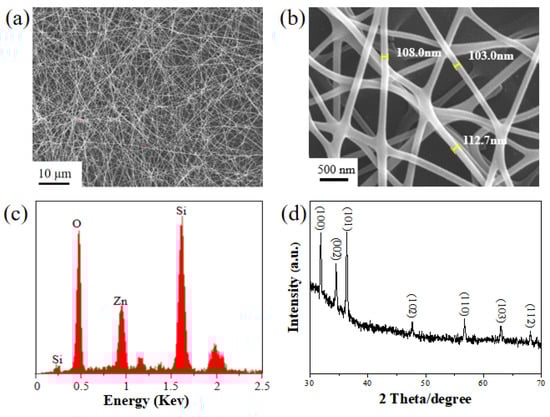 Figure 2a,b show the scanning electron microscope (SEM) of ZnO at different magnifications. The average diameter of randomly distributed ZnO NWs is 100 nm, and the density is directly proportional to electrospinning time. There are around five ZnO NWs layers stacked longitudinally in the SEM imagine at a large magnification. In sequence, the thickness of the ZnO film is estimated as 500 nm. The element information was given in the energy dispersive X-ray (EDS) analysis spectrum shown in Figure 2c, which proves the primary composition of ZnO and Si because of the existence of Si, oxygen, and Zn elements. Accordingly, the averaged element weights are 39.46%, 36.48%, and 24.06% for Si, oxygen, and Zn, respectively. In order to further analyze the crystal structures of ZnO, the X-ray diffraction (XRD) results of the sample was displayed in Figure 2d. A high crystal quality of ZnO NWs is proved by the sharp peaks [21].