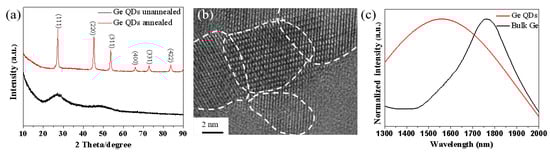 (a) XRD results of Ge QDs before and after annealing. (b) TEM image of annealed Ge QDs. (c) The PL spectra of annealed Ge QDs and bulk Ge wafer.