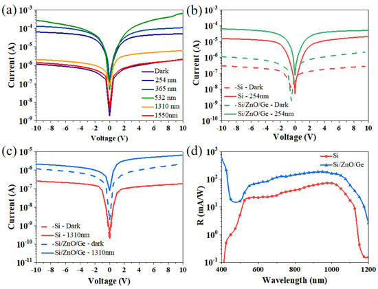 The optoelectrical characteristics are performed to verify the photodetection performance of Si/ZnO NWs/Ge QDs PD. Figure 4a shows the I–V curves of the device measured in the dark and under UV-NIR light illumination, and the optical powers are 2.3, 3.7, 7.9, 16, and 23.5 mW for 254, 365, 532, 1310, and 1550 nm, respectively. It should be noticed that the photocurrents increase dramatically under illuminated by UV-Vis light, and the high photo-to-dark current ratio allows a high signal-to-noise and is beneficial to practical applications. There is an obvious photoresponse when the photodetector is illuminated by 1310 and 1550 nm lasers, respectively. However, the responses are smaller than those illuminated by UV and vis light, and the details will be discussed below. To further analyze the characteristics of the devices, pure Si wafer as PD and Si/ZnO NWs/Ge QDs PD are illuminated under UV (254 nm) and NIR light (1310 nm), as shown in Figure 4b,c respectively. The photocurrent of Si/ZnO NWs/Ge QDs PD is almost four times larger than that of Si photodetector under 254 nm light illumination, which is attributed to the separation of the charges by ZnO NWs/Si heterojunction and the enhanced absorption coefficient in the UV band [25,26]. Before and after 1310 nm light illumination, the I–V curves of Si PD are overlapped, which indicates that there is no photoresponse of Si PD in this region. Such a feature originates from the limited cutoff wavelength (1100 nm) due to the large band gap (1.12 eV). By contrast, the Si/ZnO NWs/Ge QDs PD exhibits a conspicuous photoresponse under 1310 nm light illumination as shown in Figure 4c. This phenomenon demonstrates Ge QDs can extend the detection range in the NIR region, which plays a vital role in the broadband Si/ZnO NWs/Ge QDs PD. Figure 4d shows that the responsivity of the Si/ZnO NWs/Ge QDs and pure Si PD depends on the wavelength of incident light at −8 V reverse voltage, which can be calculated by [27,28],