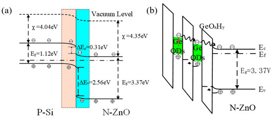 To elucidate the mechanism of unique photoresponse features of Si/ZnO NWs/Ge QDs PD under UV and NIR light illumination, the energy band diagrams of the structure are analyzed as shown in Figure 5a,b. Electron affinities of Si and ZnO are χ(Si) = 4.04 eV and χ(ZnO) = 4.35 eV, respectively [29]. The band-gaps of Si and ZnO are taken as Eg(Si) = 1.12 eV and Eg(ZnO) = 3.37 eV, respectively. In consequence, the conduction band offset for electrons is ΔEc = χ(ZnO) − χ(Si) = 0.31 eV, whereas that for holes is ΔEc = χ(ZnO) − χ(Si) + Eg(ZnO) − Eg(Si) = 2.56 eV. Therefore, type-ΙΙ energy band alignment is obtained at the interface of P-Si and N-ZnO, as shown in Figure 5a. Owing to this special energy band alignment, electrons will move to the ZnO side and holes will move to Si side due to the internal field after the generation of electron-hole pairs in ZnO NWs and Si under UV and Vis light illumination. This mechanism will facilitate the spatial separation of the photogenerated carriers and result in a larger photocurrent compared with pure Si photodetector [20]. When the hybrid PD is illuminated by NIR light, photogenerated carriers in Ge QDs need to tunnel through the GeOxHy shell when transferring to ZnO NWs under the electric field force (Figure 5b) [6]. In this case, the photoresponse in NIR range of the hybrid PD can be significantly enhanced, as shown in Figure 4c. However, few photogenerated carriers are collected by electrodes due to the difficulty of tunneling effect and the probability of tunneling is reduced with longer wavelengths in NIR region. Therefore, there is a slight performance improvement of photodetector illuminated under 1550 nm light.
