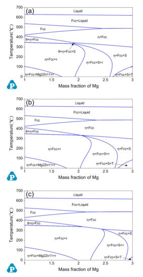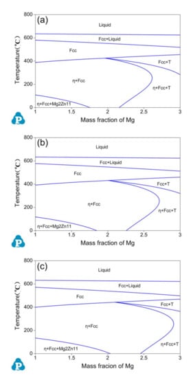 Figure 3 presents vertical sections of the Al-Zn-Mg phase diagram for (a) Al-10.5Zn-xMg, (b) Al-11Zn-xMg and (c) Al-12Zn-xMg alloys with varying Mg content (1 ≤ x ≤ 3 wt.%). It can be seen that the transition line between the two phase η + Fcc region to the three phase η + Fcc + T region rises from 2.3 wt.% Mg (Al-10.5Zn-xMg; Figure 3a) to 2.4 wt.% Mg (Al-11Zn-xMg; Figure 3b) and 2.5 wt.% Mg (Al-12Zn-xMg; Figure 3c) in the ageing temperature 120 °C. According to the calculated results, the content of Mg can be set to 2.2 wt.% to avoid the harmful T phase.
