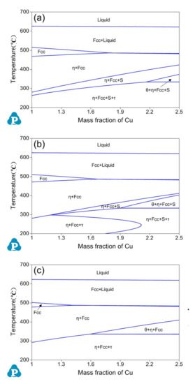 Figure 4 shows vertical sections of the Al-Zn-Mg-Cu phase diagram for (a) Al-10.5Zn-2.2Mg-xCu, (b) Al-11Zn-2.2Mg-xCu and (c) Al-12Zn-2.2Mg-xCu alloys with different Cu content (1 ≤ x ≤ 2.5 wt.%). From the Figure, one significant situation can be observed: the single phase Fcc region disappears in the whole of the temperature when the content of Cu is higher than 1.8 wt.% (Al-10.5Zn-2.2Mg-xCu; Figure 4a), 1.7 wt.% (Al-11Zn-2.2Mg-xCu; Figure 4b) and 1.5 wt.% (Al-12Zn-2.2Mg-xCu; Figure 4c), respectively. In order to retain the single phase Fcc region for homogenization and solution heat treatment, the content of Cu is set to 1.5 wt.% uniformly and the content of Mg is designed by later calculated work.