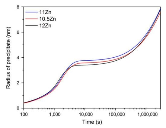 The change of the η’ precipitate radius with aging time at 120 °C for alloy compositions of 10.5Zn, 11Zn and 12Zn are illustrated in Figure 8. Similar to the precipitate density, the curves of precipitate radius exist in three parts involving nucleation, growth and coarsening. During the nucleation process, the precipitate radius is almost unchanged. In time of growth, it first increases quickly; afterwards, the growth rate is getting smaller and smaller. In time of coarsening, it continues to increase with a representative cubed rule nearly. Particularly, the values of three curves are very close in all precipitate times.