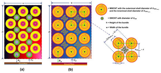 Our endeavor in this paper is to enhance the performance by altering the configuration, shown in Figure 1a. In this newly introduced configuration, illustrated in Figure 1b, the replacement of smaller MWCNTs takes place with a bunch of SWCNTs, which are wrapped up by the larger MWCNTs. This modified approach is a virtue of increasing the number of CNTs in the bundle so that we can fill up the unoccupied space with SWCNTs more efficiently and densely. The spacing between shells of MWCNTs and adjacent CNTs, equivalent to the van der Waals distance () between graphene layers in graphite, is maintained concurrently [19,20].