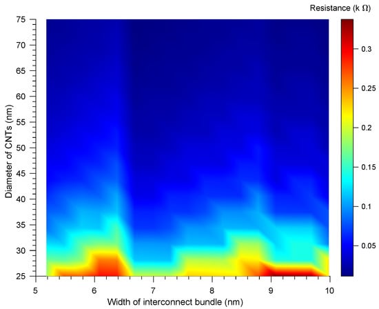 The characteristics of resistance (R) depend on both the width of the interconnect wire based on the technology node and the diameter of the used CNTs in the bundle. The simultaneous impact of both factors is observed in Figure 2. It is obvious that the lower resistance for the bundle is attainable by increasing the width of the bundle along with the diameter of the CNTs. Since it is taken into account that all the CNTs in the bundle are in parallel with each other, the increased number of CNTs can be obtained by increasing the width in a given space of the bundle, and can reduce the resistance significantly. Moreover, the increased diameter of the MWCNTs increases the number of shells, which are also in parallel to each other.