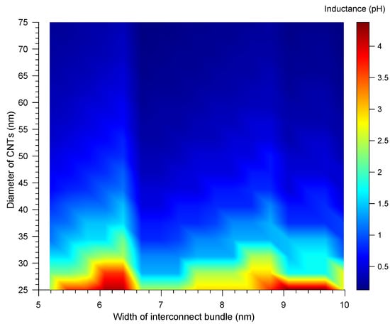 The inductance of the bundle also exhibits the same phenomena as the resistance does. The behavioral change of the inductance of the bundle, with the width and diameter of the CNTs in the bundle, is depicted in Figure 3. Based on the attained diameter, we estimate the delay of the bundle in Section 4.