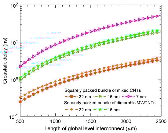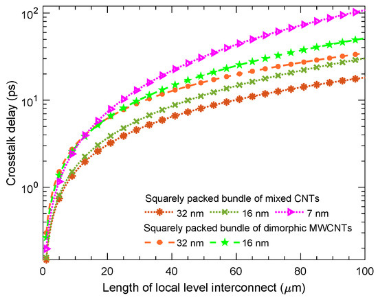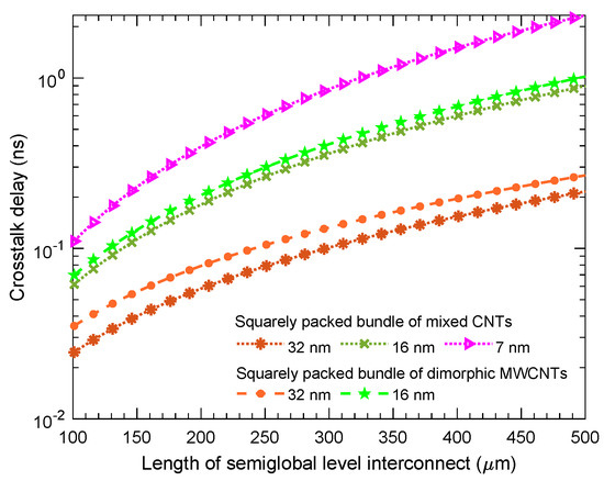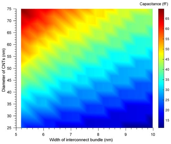 The crosstalk delay, basically, arises from the capacitance formed between the CNTs from different bundles, while it is considered that all CNTs in the bundles are in parallel [4]. The inter-bundle capacitance, the function of spacing between the the centers of two adjacent CNTs, the average diameter of the adjacent CNTs, and the relative permittivity based on the level of interconnect length, is estimated by Equation (31), where is used as the diameter because we placed MWCNTs on the edge of the bundle to reduce the overall crosstalk impact, having been motivated by previous works [6,9]: