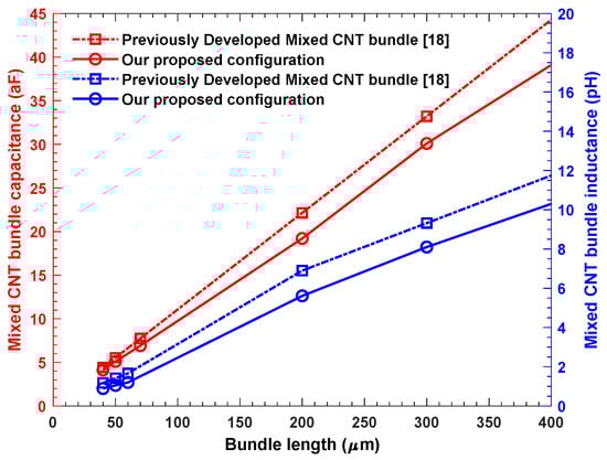 To validate the value of the proposed model, the conductance and inductance of the mixed CNT bundle is observed by varying the probability of metallic CNT (%) using Equation (1). We observe, from Figure 5, that the conductance of our mixed CNT bundle configuration varies proportionally with the percentage of metallic CNTs in the bundle. It can be deduced from expression (1) that the number of channels per shell increases with an increase in the percentage of metallic CNTs, which, in turn, reduces the resistance and increases the conductance of the bundle. As our proposed configuration is densely packed and geometrically organized, its capacity to hold a noticeably higher number of CNTs in the bundle makes the conductance of our configuration, as depicted in Figure 5, much higher than that of the mixed CNT bundle in [18]. For the same reason, our proposed configuration comes up with a lower inductance than the previous mixed CNT models in both Figure 5 and Figure 6. Figure 6, meanwhile, demonstrates that the capacitance of the proposed model increases with increasing interconnect lengths, though our configuration still sustains better performance by generating lower capacitances. In this circumstance, we can infer that by increasing the percentage of metallic CNTs and delimiting the interconnect length, we can reduce the extracted parameter and, eventually, the delay.