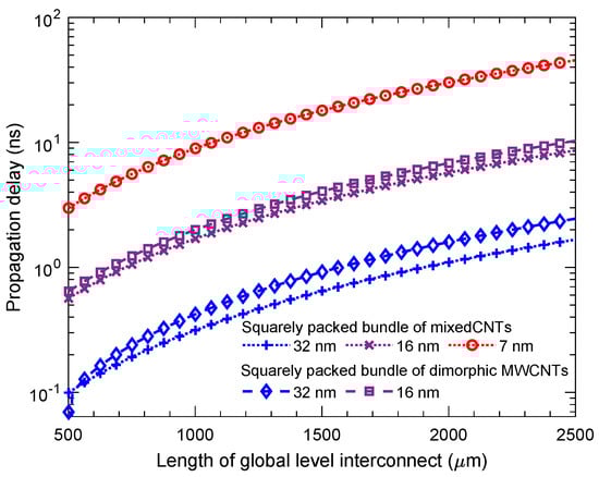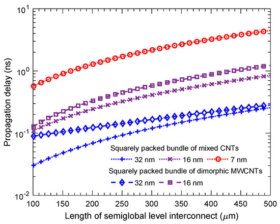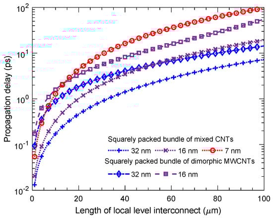 Demonstration of comparison between the propagation delay performance of a squarely packed bundle of mixed CNTs and that of dimorphic MWCNTs for global-level interconnect lengths. The size and number of accommodated CNTs for different technology nodes are mentioned in Table 1.