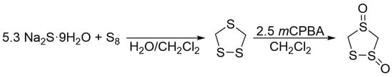 - Petzold, H.; Bräutigam, S.; Görls, H.; Weigand, W.; Uhlemann, U.; Geßner, R.; Kiefer, W.; Popp, J.; Majchrzak, A.; Mloston, G. Oxidations of sulfur rich heterocycles – new S-oxides of the parent 1,2,4-trithiolane and its tetramethyl derivative: Synthesis and structural investigations. Inorg. Chim. Acta 2004, 357, 1897–1908. [Google Scholar] [CrossRef]
