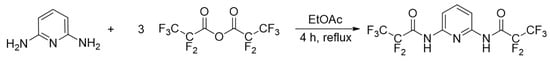 Ethyl acetate (50 mL) was added to a flask charged with 2,6-diaminopyridine (2.007 g, 18.39 mmol) and stirred to form a brown slurry. Pentafluoropropionic anhydride (4.7 mL, 55 mmol) was added to the brown slurry, upon which the reaction became a clear brown solution. This mixture was refluxed for 4 h and then allowed to cool to room temperature. The excess pentafluoropropionic anhydride was quenched with a saturated sodium carbonate solution (30 mL), warming the solution and bubbling vigorously. The reaction was then transferred to a separatory funnel and shaken and allowed to separate. The organic layer was brown and the aqueous layer was light yellow. The organic layer was collected and dried with anhydrous magnesium sulfate, filtered and the solvent was removed to yield a crude brown product. This crude material was purified by column chromatography on silica gel using 30% ethyl acetate in hexanes as eluent to isolate an off white powder that formed needles from slow evaporation of a concentrated chloroform solution (2.2 g, 30% yield). TLC (30% ethyl acetate in hexane): Rf = 0.67. NMR spectral data for this compound were consistent with those previously reported in the literature [31]. This synthesis is depicted in Figure 2.