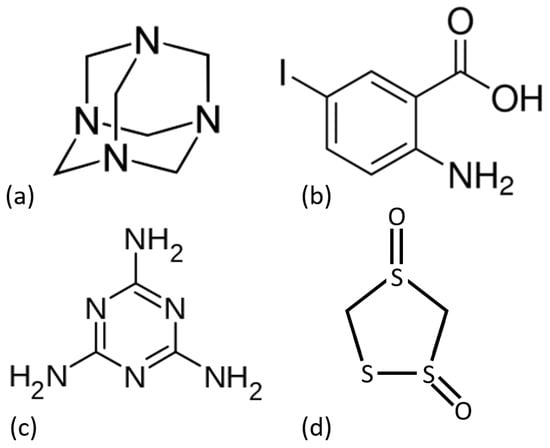 Molecular structures of: (a) Hexamine (b) IAA (c) Melamine (d) TTDO.