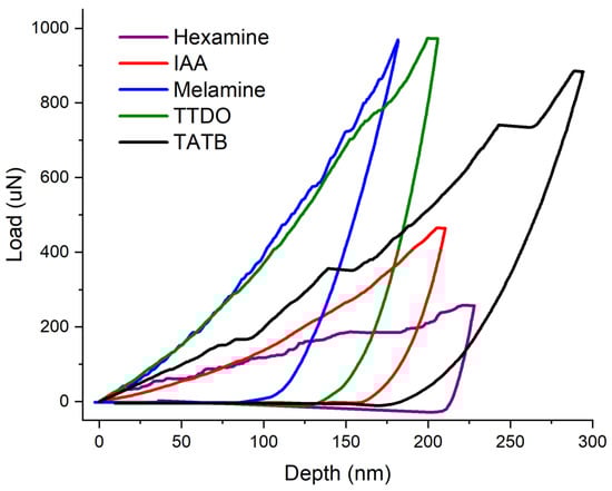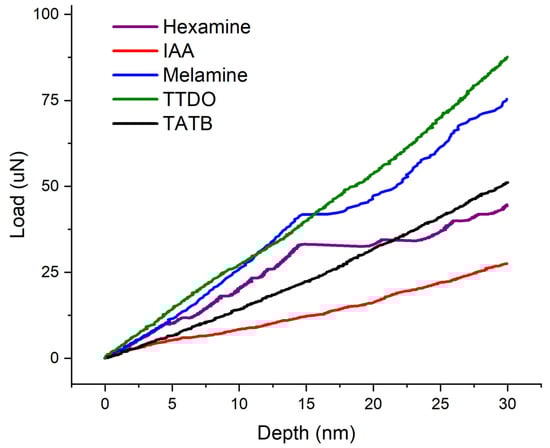Representative load–depth curves for nanoindentation experiments performed on IAA, hexamine, melamine, and TTDO, are shown in Figure 5.