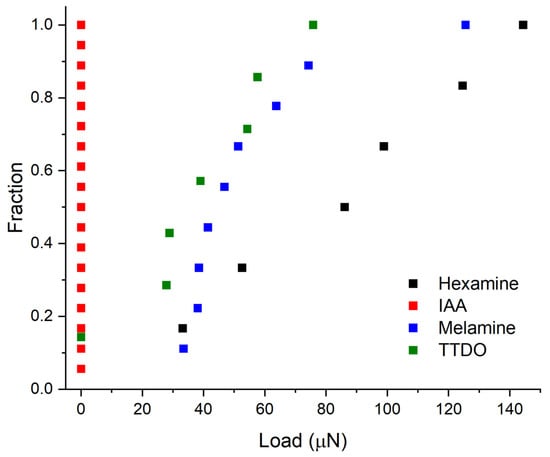 Cumulative distribution of load at yield for hexamine, IAA, melamine, and TTDO.
