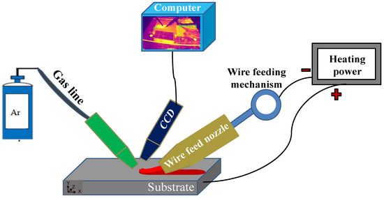 The forming principle of RAM technology is shown in Figure 1. The positive and negative electrodes of the programmable power supply are connected with the wire and the metal substrate, respectively. The wire is transported by the pulsating wire feeder; when the wire is in contact with the substrate, the current flows through the metal wire, and the tip metal wire in contact with the substrate is generated by thermal resistance melting through the Joule effect. As the workbench moves, the wire continues to be fed and melts the tip metal wire, repeating this process to form dense metal parts. The forming process is protected by inert gas (Ar) to avoid oxidation. A high-speed camera system CCD and a voltage-current acquisition system are used to achieve the monitoring of the image changes and electrical signal changes during the melting of the wire. This technology uses low voltage and high current to avoid arcing during the forming process.