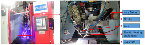 With the demand for high-performance, large, integrated, high-strength, and low-cost metal structural parts in the aerospace and automotive industries [1,2], metal additive manufacturing printing technology has become a hot topic for research and applications in additive manufacturing technology [3,4]. According to morphology, the raw materials of metal additive manufacturing technology can be divided into powder and wire [5]. With its advantages of high material utilization rate, high deposition rate, low cost, and low pollution, wire has been widely used in the field of metal additive manufacturing [6,7,8]. Current mainstream metal wire additive manufacturing technologies include Laser Additive Manufacturing (LAM), Electron Beam Additive Manufacturing (EBAM), Wire and Arc Additive Manufacturing (WAAM), and Wire and Plasma Additive Manufacturing (WPAM) [9]. LAM has high forming accuracy, high flexibility, and a short manufacturing cycle [10], but has low energy utilization; the residual stress of the formed part is large, and the cost of the laser head is high [11]. EBAM has high energy utilization and forming efficiency, but the size of the formed parts is limited by the volume of the vacuum chamber and the consequent increase in cost [12,13,14]. WAAM and WPAM have the advantages of low cost and high deposition efficiency [15], but the process parameters of both are variable and complex, and the dimensional accuracy of the manufactured parts is not high [16,17]. Reducing manufacturing costs, improving forming accuracy and efficiency, and ensuring forming quality are of great significance to the widespread application of metal wire additive manufacturing technology.