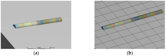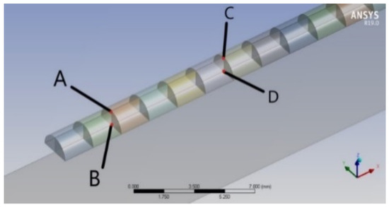 The single-channel melting layer model shown in Figure 3a was established by Ansys and meshed (shown in Figure 3b). The melting layer was 30 mm in length, 0.8 mm in diameter, and 0.6 mm in height. Using hexahedral cells to mesh improved the computational efficiency. The total number of elements was 1350 and the number of nodes was 7567.