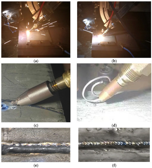 In this paper, care was taken to ensure the consistency and comparability of the calculations. It was found through previous experiments that sparks will occur in the printing process when the voltage is too large (Figure 5a), that the wire cannot be effectively melted when the voltage is too small, and that good results without sparks can be achieved when the voltage is 10 V (Figure 5b). When the workbench moves too slowly, the conductive nozzle becomes blocked (Figure 5c); if it moves too fast, the wire cannot be melted (Figure 5d), but it is stable at 5 mm/s. When the gas flow rate is too low, the oxidation is more significant (Figure 5e). When the gas flow rate reaches 0.7 m3/h, oxidation can be effectively prevented (Figure 5f). In this paper, the current was used as a single variable to analyze whether the wire would melt better under different currents. The current values were 130 A, 160 A, and 190 A, respectively. The wire feeding speed was initially set as 2.4 m/min. The parameter selection is shown in Table 2.