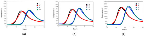 Monitoring the real-time temperature change of the melting coating process is very beneficial to the study of the melting coating forming process and the optimization of the later process parameters. In this paper, the temperature probe monitoring points A, B, C, and D were selected to obtain the temperature–time change images of different process parameters, as shown in Figure 6.