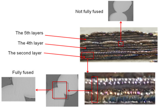 When other parameters remained unchanged, the influence of wire feeding speed on the forming appearance was studied experimentally, as shown in Table 4. When the wire feeding speed was 2.0 m/min, the wire feeding speed was too slow to form continuously, and the appearance was not good. Under the same current, when the wire feeding speed was 2.4 m/min, dense continuous forming was realized, which was firmly adhered to the substrate and had good shape. When the wire feeding speed was 2.8 m/min, the melting speed of the wire could not keep up with the wire feeding speed and the wire could not be completely melted, and the shape of the formed sample was distorted. It can be seen that the wire feeding speed had a great influence on the shape of the formed RAM.