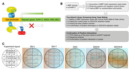 - Chien, C.T.; Bartel, P.L.; Sternglanz, R.; Fields, S. The Two-Hybrid System: A Method to Identify and Clone Genes for Proteins That Interact with a Protein of Interest. Proc. Natl. Acad. Sci. USA 1991, 88, 9578–9582. [Google Scholar] [CrossRef] [PubMed] [Green Version]