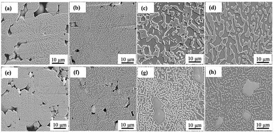 SEM images of the Co–Cr–W alloy and the Co–Cr–W matrix composites with different sintering temperature. (a–d) Co–Cr–W alloy; (e–h) Co–Cr–W matrix composites; (a,e) 1000 °C; (b,f) 1100 °C; (c,g) 1150 °C; (d,h) 1200 °C.