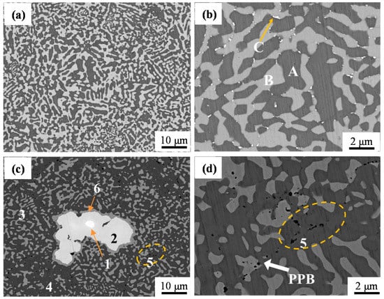 As the proper sintering temperature is 1150 °C, the microstructures of the Co–Cr–W alloy and Co–Cr–W matrix composites were analyzed with this preparing condition, and the backscattering electron images of the two materials are illustrated in Figure 4. According to the image contrast, there are three and five phases in the Co–Cr–W alloy (Figure 4a,b) and the Co–Cr–W matrix composites (Figure 4c,d), respectively, which are marked by A~C and 1~5, respectively. In the Co–Cr–W alloy, phase-B is dendrite, which is crisscross distributed in the matrix (phase-A). The phase-C is a fine particle, which is distributed at the junction of the phase-A and B. In the Co–Cr–W matrix composites, phase-1 is wrapped by the phase-2. The phase-3 is also dendritic and uniformly distributed in phase-4, and there is a thin layer of gray phase (phase-6) at the boundary of phase-2 and phase-3. The image contrasts of phase-3 and phase-6 are almost the same. In addition, some primary particle boundaries (PPBs) can be observed (Figure 4c,d), and the phase-5 is mainly distributed at the PPBs.