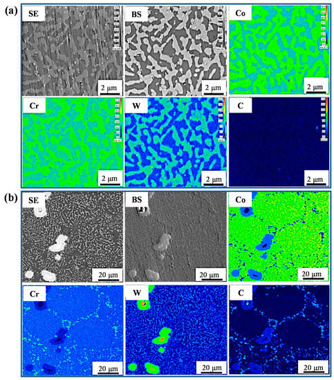 The element distribution maps of a micro-area of the Co–Cr–W alloy and the Co–Cr–W matrix composites. (a) Co–Cr–W alloy; (b) Co–Cr–W matrix composites.