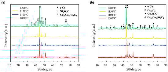 Figure 3 shows the microstructure of the Co–Cr–W alloy and Co–Cr–W matrix composites prepared at different sintering temperatures. At the sintering temperature of 1000 °C and 1100 °C, there are many hole defects in the Co–Cr–W alloy and the Co–Cr–W matrix composites (Figure 3a,b,e,f), and the added carbides in the composites do not fully bond to the matrix. In addition, the microstructure of the Co–Cr–W alloy is consistent with that of the composites. At the sintering temperature of 1150 °C and 1200 °C, the sintered materials are compact and do not have any holes. The reinforced phases are closely combined with the matrix. Based on the results, it can be determined that the diffusion between the powders increases with the increase of sintering temperature, which increases the compactness of the materials. However, we found the materials were bonded to the mold at 1200 °C, so we inferred the materials could react with the mold at this temperature. Therefore, 1150 °C is the proper sintering temperature. In addition, increasing the sintering temperature could not change the phase constitution of the two materials based on the SEM images (Figure 3). This can also be confirmed by the following the XRD results (see Section 3.2).