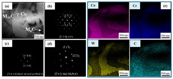 (a) TEM bright-field image of the Co–Cr–W alloy; (b–d) Selected area electron diffraction (SAED) patterns of γ-Co (b), M29C (c), and M6C (d); (e) and EDS maps performed on a micro-area.