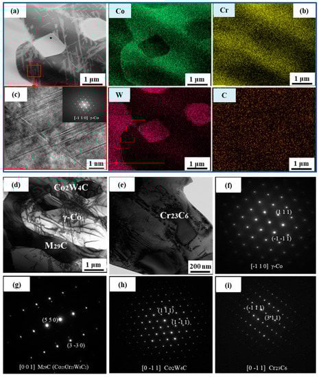 (a) HAADF images showing the precipitates in the Co–Cr–W matrix composites; (b) displaying the related EDS mapping results; (c) high-resolution electron image of the γ-Co phase; (d,e) bright-field image showing the precipitates in the Co–Cr–W matrix composites; (f–i) SAED patterns of the related phases.