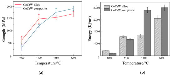 Figure 11 shows the three-point bending experiment results of the Co–Cr–W alloy and Co-Cr-W matrix composites at different sintering temperatures. The bending strengths and of the two materials increase with the increase of the sintering temperature (Figure 11a). This is because increasing the sintering temperature can improve the compactness of the two materials (Figure 3). However, the increasing rates of the two materials are different. When the sintering temperature is below 1150 °C, the bending strength of the Co–Cr–W alloy is higher, while when the sintering temperature is over 1150 °C, the bending strength of the Co–Cr–W matrix composites are higher.