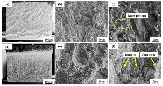 The reason for this should be that the compactness of the two materials is very low at the low sintering temperature, and the reinforced phases are not well combined with the matrix. Thus, the reinforced phases do not enhance the composites, and on the contrary, it is equivalent to introducing impurities into the material, resulting in the bending strength of the composite material being lower than that of the pure alloy. However, when the sintering temperature is high, both materials are fully sintered, and the M23C6 and M6C carbide at the PPB are closely bonded with the matrix material, which can strengthen the grain boundary to a certain extent. In addition, the toughness of the two materials has the same trend as the bending strength with the increase of sintering temperature (Figure 11b). This is not only related to the compactness but also the strength of the matrix of the composites. As the result shows, the addition of the reinforcing phases would make the solid solution elements (W, Ni, and Cr) in the matrix diffuse to the added reinforced phases, which can reduce the strength and improve the plasticity of the matrix, and finally lead to the improvement of the toughness of the composites. According to the fracture of the two materials, it proves that the fracture of the Co–Cr–W alloy is cleavage fracture which is characterized by river pattern (Figure 12a–c), and the composites display the fracture features of the dimple fracture (Figure 12d–f). The results indicate the multi-scale reinforced phases added to the sintered composites can effectively improve the bending strength and toughness.