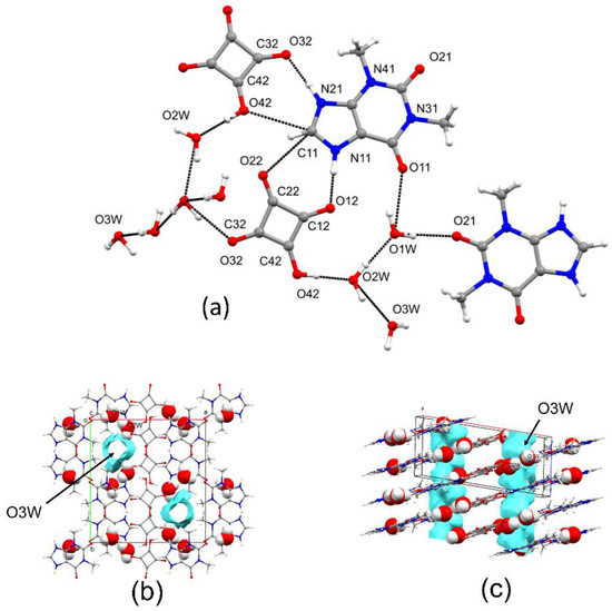 The asymmetric unit comprises one molecule of theophylline, one molecule of squaric acid, and three molecules of water (See Figure S8). Theophylline exchanges four HBs with two squarate anions via the N11, N21, and C11 atoms (N11⋯O12, 2.63 Å; N21⋯O32, 2.64 Å; C11⋯O22, 3.03 Å; C11⋯O42, 3.12 Å). Interestingly, C11 forms a bifurcated HB with two squarate anions. In addition, O11 and O21 of Theophylline act as HB acceptors with respect to two symmetry-related O1W water molecules (O21⋯O1W, 2.77 Å; O11⋯O1W, 2.92 Å). The two components interact through a HBs connectivity involving two water molecules (O1W and O2W). O1W exchanges three HBs, two as a donor, as already described, and one as acceptor (range 2.74 Å–2.92 Å), O2w exchanges three HBs, two as a donor, and one as acceptor (range 2.53 Å–2.82 Å). O3W forms two HBs as a donor with a symmetry related molecule (3.31 Å) and with O32 of a squarate anion (2.84 Å), respectively, and it accepts HBs from O2W (2.82 Å), Figure 1. On the other hand, O3w is located into a channel like cavity and, according to the long HB distances, it is more loosely bound to the surrounding molecules, Figure S8.